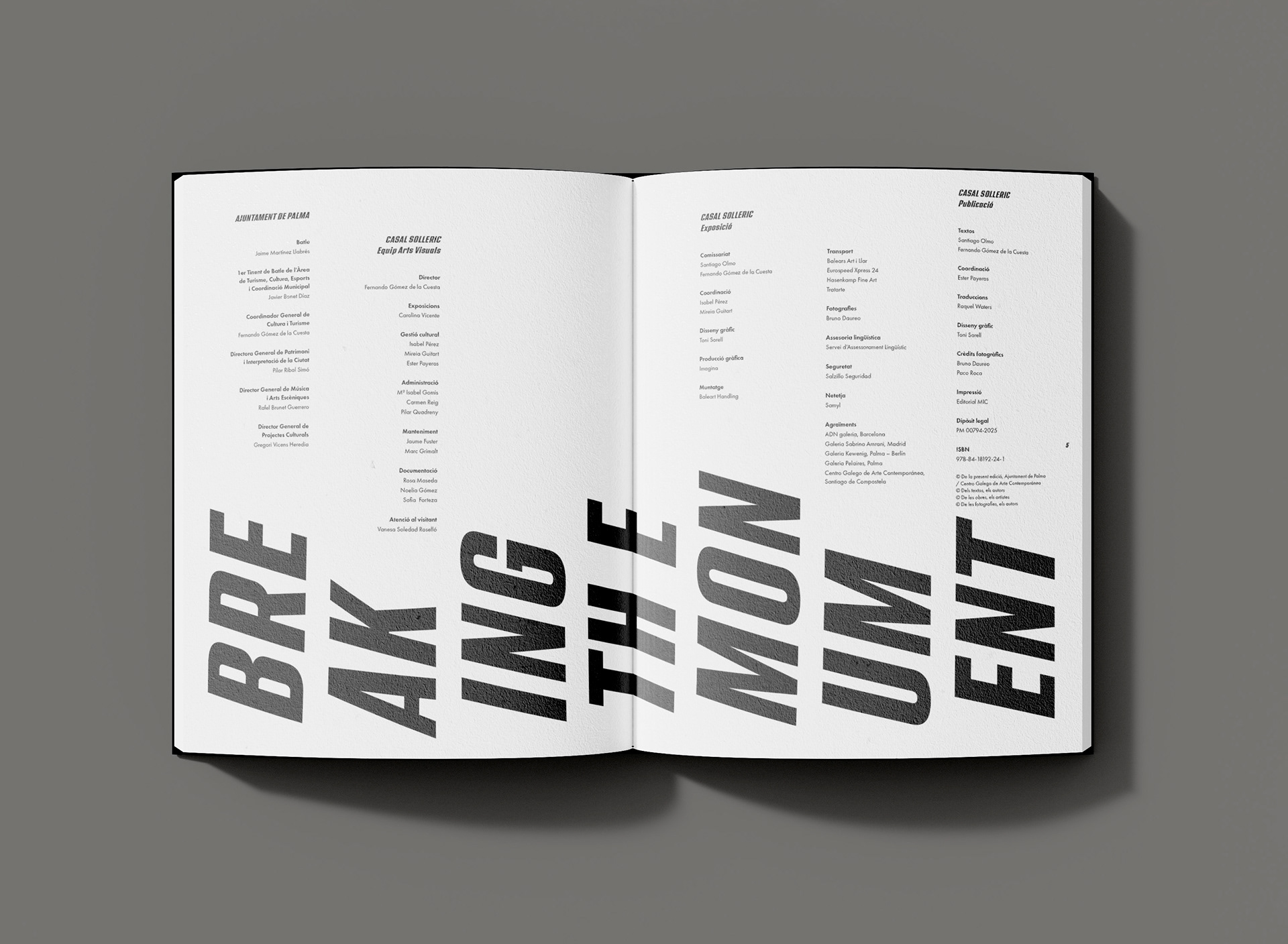 Catálogo para las exposiciones “Breaking the Monument” en el Casal Solleric y en el CGAC. Catálogo “flip book” con 2 portadas que se leen girando 180 grados. Catalán, castellano, gallego e inglés. 21,8 x 28 cm, 200 páginas, tapas duras, 300 ejemplares.